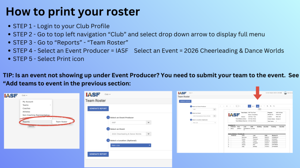 Go to Events in the top left navigation and then select IASF – 2026 Cheerleading and Dance Worlds. Add your teams to the event. See slides 30 – 34 in the How to Guide.